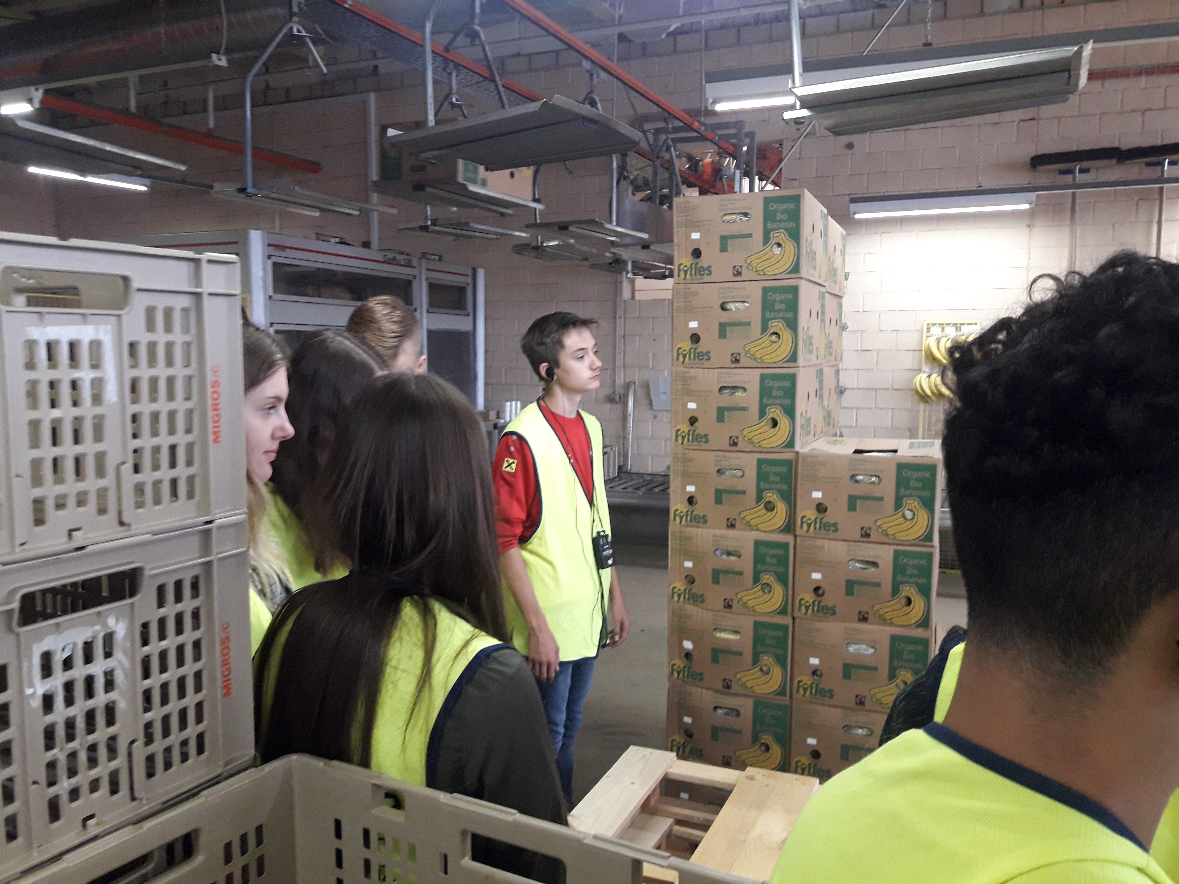 In den letzten Schultagen standen auch für die LogistikerInnen verschiedenste Exkursionen an. So fuhr die 1aWL gemeinsam mit ihrer JV Miriam Filler u. Patricia Tschallener nach Gossau, um die Migroszentrale Ostschweiz zu besichtigen. Nach einem kurzen Willkommensfilm ging es durch die verschiedenen Lager-, Verarbeitungs-, Kommissionier- u. Verpackungshallen. Es sind die unterschiedlichsten Fördertechniken im Einsatz, welche den SchülerInnen inklusive deren Vor- und Nachteile erklärt wurden. Zudem konnten die SchülerInnen Einblicke in die Fleisch- und Wurstverarbeitung, Verpackungstechniken von Obst u. Gemüse, teils vollautomatisierte Kommissioniersysteme, Verladung u. Entladung für die Schiene u. Straße und in die Reinigung sowohl der Behälter als auch der Bekleidung gewinnen.