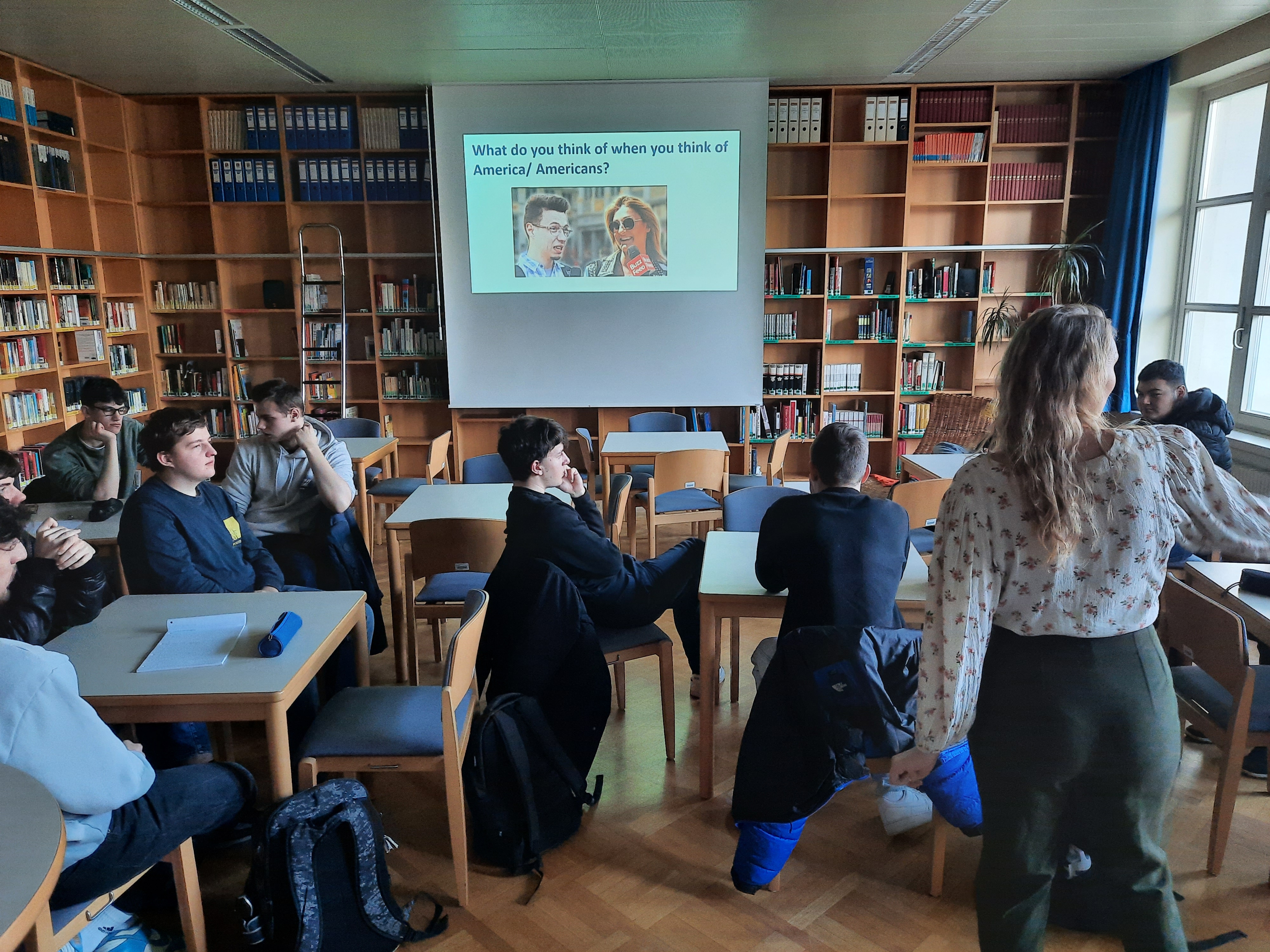 Kayla is an American "teacher on the road" and has been teaching several classes. She has prepared several activities and has talked about Austrian versus American culture, British versus American English and politics in the USA.